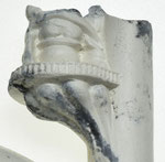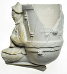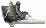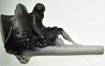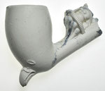 Dit is een typische fantasiepijp. De vorm is atypisch, de voorstelling dient geen enkel doel. De pijp is vooral merkwaardig. De kop is onbewerkt, op een vogelkop aan de onderkant na. De kop bestaat uit een snavel die uit de pijpenkop steekt als een spoor, van de steel af. Boven de snavel staan aan weerszijden twee ogen die uit niet meer dan een elliptische lijn bestaan. De uitgewerkte voorstelling zit op de bovenkant van de steel. Er is een plateau aangebracht met een geribbelde rand, die wordt gedragen door een voet van lobben. Op het plateau zit een dame op een pot, De dame heeft een lang jurk aan en aan haar voorkant is te zien dat ze zit. Aan haar achterkant houdt ze haar jurk opzij en zijn billen op een pot te zien. Zij zit niet daadwerkelijk op de steel, maar door het plateau zit ze met de steel mee. De voorstelling is wellicht ondeugend bedoeld, maar is vooral merkwaardig.