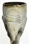 Een Chinees door de pijpenkop. Rondbodem model pijp met hoornvormig gekromde pijpenkop. Het oppervlak van de kop is helemaal gearceerd en stelt iets voor, het lijkt nog het meest op een boomstam. Door de boomstam heen steekt het lichaam van een mens met klassieke Chinese trekken, maar wel karikaturaal. Twee dingen vallen op aan de boomstam. Eerst loopt er langs de bovenzijde, door de 'gevangen' figuur heen, een dubbele horizontale lijn, alsof er twee helften van de stam op elkaar zijn gezet. Dan loopt er nog een 'riem' vanaf het onderlijf bij de steel diagonaal naar de onderkant van de pijpenkop. Aan de steelzijde is het onderlijf en de benen zichtbaar. De voeten raken pas later de steel, zodat ruimte tussen de steel en de benen is ontstaan. Van de steel af steken een hoofd en twee armen uit de pijpenkop. De handen komen onderaan de kop bij elkaar. De kleding stelt een Aziatisch gewaad voor. Het hoofd is kaal, maar vanuit het achterhoofd loopt een lange vlecht de linkerkant van de pijpenkop op. Ook is er een lange puntsnor aanwezig. De ludieke voorstelling refereert waarschijnlijk aan een verhaal.