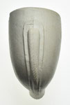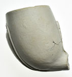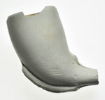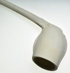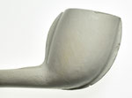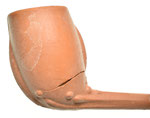Rondbodem pijpenkop uit de periode 1875-1900. Shagpijp ketelgrootte. Aan de voor- en achterzijde van de kop, op de persnaden, zit een enkele lob, die als een smalle rand uitsteekt. De rest van de kop en de steel is onbewerkt, maar de kop is nog wel licht geglaasd.