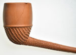Isabé model pijp met op de pijpenkop een blad- of schelpenmotief, dat loopt van de steelaanzet tot ongeveer een centimeter onder de ketelrand. De persnaden zijn afgesneden met een verticale kamstreek.Op de scheiding van de kop en de steel loopt een diagonale lijn en dat is het belangrijkste verschil tussen deze pijp en die er boven.