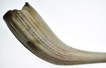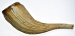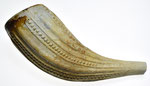 Hoornmodel pijpen met dezelfde versiering als de pijpenkop erboven. 1875-1900. De kop is verdeeld in verticale banden (op de hoornpijp lijkt het meer horizontaal door de vorm van deze pijpen) met een verdikking over het midden. Langs de zijden van de banden loopt een contourlijn, de scheidingen zijn opgevuld met verticale rijen punten. Na het bakken is de pijp geglazuurd/ geverfd met een goudbruine kleurstof.