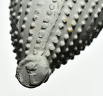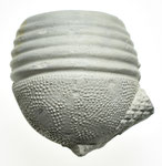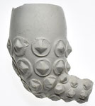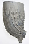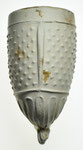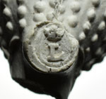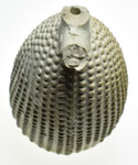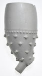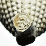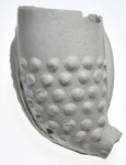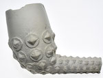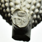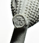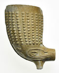 Rondbodem model pijpenkop met pantser-knoppen . Het motief op deze pijpenkop doet denken aan ingeslagen klinknagels om een pantser te verstevigen. Het motief loopt over de onderste helft van de pijpenkop en op de steel. Een enkel onderdeel van het motief bestaat uit een cirkelvormige lijn waarin een stompe piramidevorm is gezet, de assen horizontaal en verticaal.