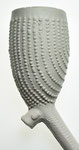 Rondbodem model pijpenkop met een horizontale band als scheiding tussen de onder- en bovenkant. De bovenste helft is onbewerkt, de onderste helft is versierd met diagonale stippenrijen die het hele oppervlak bedekken. Op de overgang naar de steel gaat de versiering over in diagonale lijnen, afgewisseld met diagonale stippenrijen. De uitvoering verschilt in wit of rood, de bovenste helft werd ook wel eens gelakt. Vroeg 20e eeuwse pijpen.