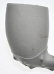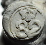 Kromkop model pijp met spoor. Gelijksoortig aan de pijpenkop hierboven. Behalve de spoor is op het onbewerkte, onderste gedeelte van de pijpenkop een floraal motief geplaatst, met krullen en blad.