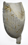 Kromkop model pijp, mogelijk Isabé, met verticale lijnen over de hele kop. De hiel loopt uit tot een breed vlak, maar is niet gemerkt. De bovenrand lijkt met het botteren iets over de lijnen te zijn geslagen.