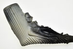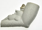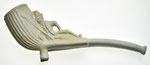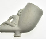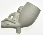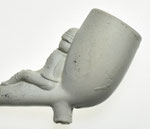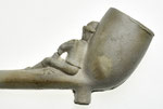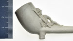 Dit is een veelvoorkomende uitvoering van pijpen met een rustende jager er op. Gezien de hoogte van de pijpenkop gaat het om sigaren- of sigarettenpijpen en gelet op de afwerking zijn we al voorbij 1900. (Het maatbalkje op de eerste foto is niet langs de as van de kop geplaatst en geeft daarom een vertekend beeld van de hoogte van de pijpenkop. Die is eerder 20 plus mm.) De modellen zijn al in de 19e eeuw gevormd en in gebruik gebleven. De details zijn in de tussentijd verwaterd. Een enkele keer wordt er een merk geplaatst.