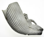 Gecanneleerde en gearceerde pijp, zwart gebakken, uit een stort van Hendrik van der Pool. Tegen de pijpenkop ligt een rustende herderin. Bij de herderin ligt een schaap te slapen.