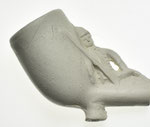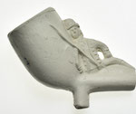 Gearceerde pijpfragmenten uit een stort van Hendrik van der Pool, 1860-1870. Tegen de kop ligt een rustende jager. Achter zijn rug staat een jagerstas en voor hem ligt zijn geweer. Het model van de kop is identiek aan die van de hieronder afgebeelde pijp met herderin en komt ook overeen met pijpenkoppen hierboven. Opvallende details zijn het voorkomen van een modelnummer, No 7, en het fragment met H.V(AN DER POOL) op de steel. Op een ander steelfragment staat dan weer alleen 'IN GOUDA'. Binnen het model zijn kleine variaties in uitvoering geweest.