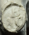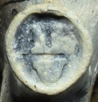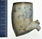 Een leuke vondst is dit misbaksel uit het centrum van Gouda. De kop is omgezet, maar de bovenste helft heeft niet goed vastgezeten en is losgegaan tijdens het bakken. Op de onderste helft is goed te zien dat het oppervlak van de doorsnede zo ruw mogelijk is gemaakt, om de helften weer goed aan elkaar te kunnen plakken. De pijp is ook weer gemerkt met ES gekroond en is afkomstig uit de tweede helft van de 19e eeuw.