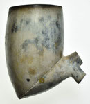 Omgezette ovaalvormige pijpenkop uit de periode 1825-1850. De kop is met de hand omgezet en weer aangesmeerd. Een typisch kenmerk is de over de snijrand lopende radering. De pijp is gemerkt met ES gekroond (dat vanaf 1842 in de handen van de familie Goedewaagen is). Een veelvoorkomende 'fout' bij het maken van dit model is dat de onderkant en de bovenkant van de pijpenkop niet meer in één lijn met elkaar staan. Op de foto's is te zien dat de hiel diagonaal naar links staat.