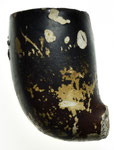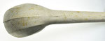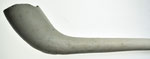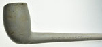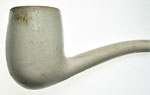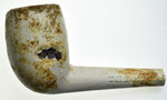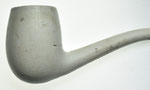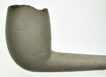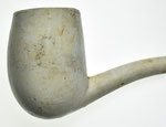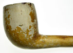 Rondbodem model pijpenkop met een sterk van de steel af gemodelleerde vorm. De pijp is bruin gelakt geweest om houten pijpen te imiteren.